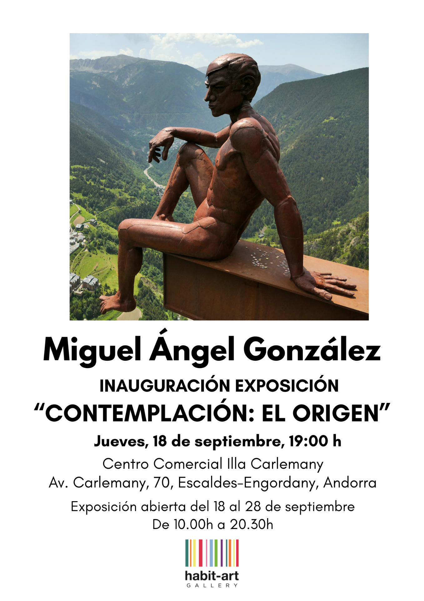 Tenemos el placer de invitaros a la inauguración de nuestra nueva exposición: "Contemplación: El origen", una muestra del artista Miguel Ángel González, que se inaugurará mañana jueves 18 de septiembre a las 19:00 h en el centro comercial Illa Carlemany, en Andorra. A partir de esta fecha, la exposición podrá visitarse hasta el 28 de septiembre de 10.00 h a 20.30 h.